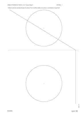 Ficha en PDF Solución Para hallar la sección que produce un plano oblícuo en una esfera podemos dibujar planos auxiliares que corten al plano y a la figura. 1. Trazamos planos horizontales que corten a la esfera en circunferencias (que se ven en verdadera magnitud en el PH) y al plano P en rectas horizontales. 2.Donde las rectas corten a las circunferencias vamos hallahdo puntos de la circunferencia. 3. la sección ha de ser una circunferencia: basta con hallar el radio de esta.
