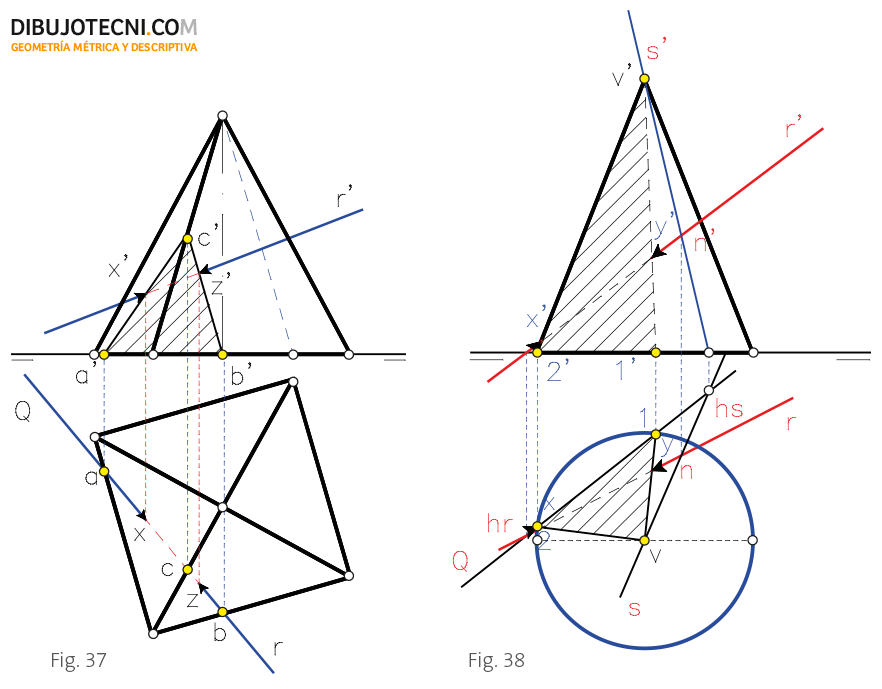 Las generatrices trazadas cortan a la recta R en los puntos X e Y buscados. (La recta R y la sección 1V2 pertenecen al mismo plano Q de modo que los puntos de intersección X e Y de las proyecciones de los lados del polígono y la recta, son corte real entre estas.) Figura 38.